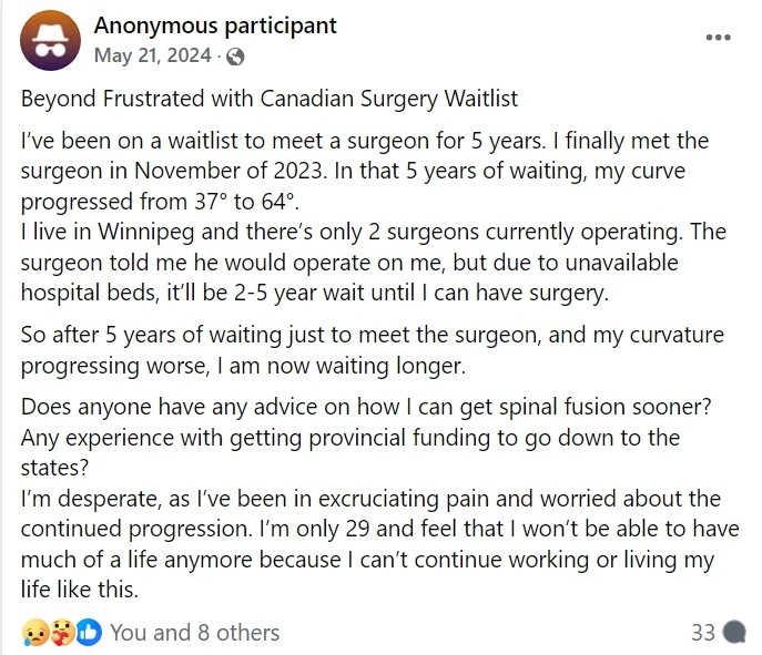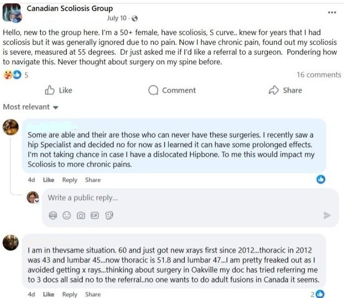 Panicked and stressed out parents have posted on the public Facebook group 'Canadian Scoliosis Group', (over 2400K users (August, 2024 was 1k) and growing) searching for treatment for their children, this is one typical post from 2024;